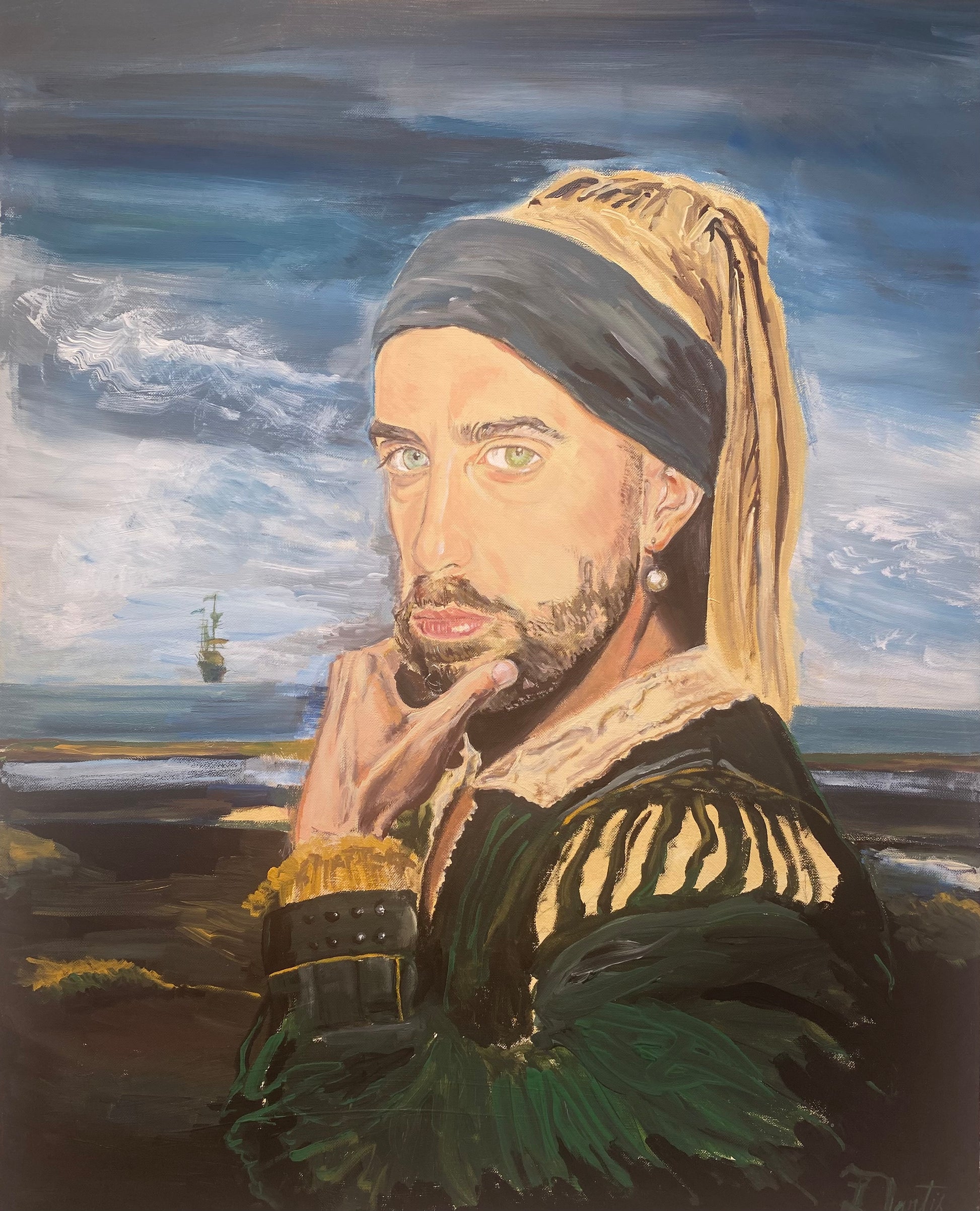 Inspirée par le chef-d'œuvre intemporel de Johannes Vermeer, 'La Jeune Fille à la perle', Nadine Dartis vous dévoile une interprétation audacieuse qui traverse les mers et les siècles. Imaginez un corsaire, écho masculin de la jeune fille mystérieuse, portant une perle. L'arrière-plan révèle son bateau, majestueux sur l'océan, sous un ciel orageux qui promet une tempête. Cette œuvre est une célébration de l'aventure que constitue l’expérience humaine.