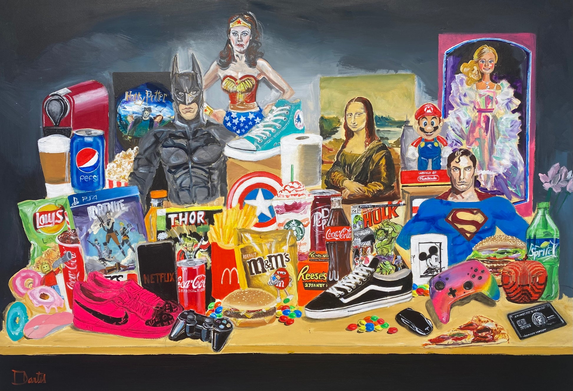 Avec cette œuvre, Nadine Dartis nous invite à réfléchir sur notre relation avec les objets et marques omniprésents de la culture de masse et comment ils deviennent à leur manière de nature morte contemporaine qui raconte des histoires sur notre époque, nos valeurs et nos désirs. Ce tableau pourrait être vu comme une critique, ou une célébration de la culture de consommation, selon l’interprétation et soulève des questions sur la durabilité, l’identité culturelle et l’impact de la globalisation sur nos choix et nos modes de vie.